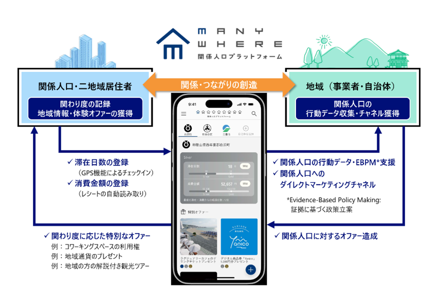 NRIデジタルが開発している関係人口プラットフォームアプリ「MANYWHERE」では、「関係人口の可視化」に向けて、二地域居住者と自治体や事業者の双方をつなぐサービスを実現します。二地域居住者は、自身の滞在履歴を記録できるだけでなく、アプリを介して、その地域との関わり度合に応じた特別な地域体験オファーを得ることができます。自治体や事業者にとっても、アプリ登録者の関与・活動状況をデータで把握することができるため、地域に関わる人々に向けたサービスのさらなる改善につなげていくことが可能です。